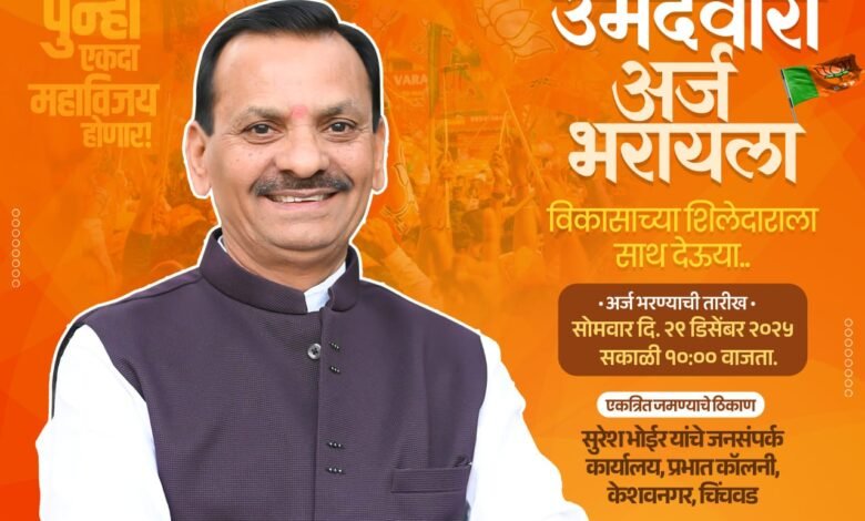 आज सोमवार, दिनांक २९ डिसेंबर २०२५ रोजी सकाळी १० वाजता उमेदवारी अर्ज भरण्यात येणार असून, सुरेश भोईर यांच्या जनसंपर्क कार्यालय, प्रभात कॉलनी, केशवनगर, चिंचवड येथे नागरिक, कार्यकर्ते व समर्थक मोठ्या संख्येने उपस्थित राहणार आहेत. या निमित्ताने शक्तिप्रदर्शन होण्याची शक्यता असून, भाजपकडून निवडणूक प्रचाराला अधिक वेग मिळणार आहे.