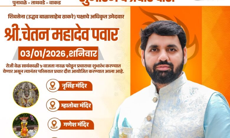 पिंपरी, (महाराष्ट्र ब्रेकिंग न्यूज) – पिंपरी-चिंचवड महानगरपालिका सार्वत्रिक निवडणूक २०२५–२६ च्या पार्श्वभूमीवर प्रभाग क्रमांक २५ (पुनावळे–ताथवडे–वाकड) मध्ये शिवसेना (उद्धव बाळासाहेब ठाकरे) पक्षाचे अधिकृत उमेदवार चेतन महादेव पवार यांच्या प्रचाराला आज शनिवारी, दि. ३ जानेवारी २०२६ रोजी औपचारिक सुरुवात होणार आहे. पारंपरिक पद्धतीने नारळ फोडून प्रचाराचा शुभारंभ करण्यात येणार असून, त्यानंतर परिसरात भव्य प्रचार दौरा आयोजित करण्यात आला आहे.